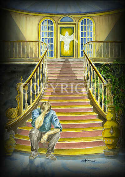 Done for a friend, this watercolor painting is the subject of Revelation 3:17 & 20. You say, "I am rich; I have acquired wealth and do not need a thing." But you do not realize that you are wretched, pitiful, poor, blind and naked. Here I am! I stand at the door and knock. If anyone hears my voice and opens the door, I will come in and eat with him, and he with me." |